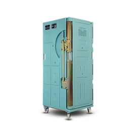 Używany kontener rolkowy izotermiczny o wymiarach zewnętrznych 715x810x1900mm i wymiarach wewnętrznych 550x640x1600mm. Ten pojemnik izotermiczny ma ramę ze stali nierdzewnej w dnie z 2 stałymi kołami i 2 kółkami, ciężar własny izotermicznego pojemnika na rolkę wynosi 100 kg. Ten izotermiczny pojemnik rolkowy ma jednoczęściową obudowę z EPDM, dzięki czemu jest łatwy do czyszczenia i pozostaje higieniczny, ponieważ nie ma rowków ani szwów. Obudowa EPDM zawiera piankę izolacyjną PU o współczynniku przewodzenia ciepła 0,39 W / m2.k.
