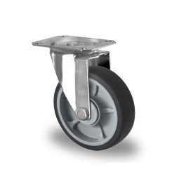 Koło obrotowe z łożyskiem kulkowym, rdzeń z PP, bieżnik z szarej termoplastycznej gumy. Kółko ma nośność 160kg.