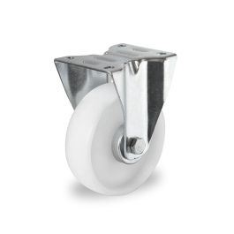 Koło stałez polipropylenu ⌀ 100mm do rollkontenerów. Ekstra mocne kółka o nośności do 100kg, a tym samym nadaje się do ciężkich ładunków. Kółko wraz z mocowaniem waży 0,55kg. Zarówno rdzeń koła jak i jego bieżnik wykonane są z wytrzymałego polipropylenu (PP). Koło jest dość hałaśliwe, ale niesamowicie wytrzymałe.
