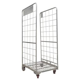 Używany, gniazdowy, 2-ścienny wózek siatkowy wykonany z ocynkowanego metalu z metalowym dnem o konstrukcji w kształcie litery A. Wyposażony w kratkę na dole i 2 ściany z tekstylnymi pasami. Wymiar oczka w ścianach bocznych 140 x 145 mm. Wymiary zewnętrzne to 800 x 700 x 1770 mm, wymiary wewnętrzne to 800 x 650 x 1570 mm. Nośność dynamiczna wynosi 500 kg. Kontener rolkowy ma innowacyjną konstrukcję, jest wyposażony w składane dno z unikalnym systemem sprężyn. Kontener rolkowy ma metalową podstawę z 2 kołami skrętnymi i 2 stałymi. Dzięki temu kontener jest bardzo zwrotny i bardzo przyjazny dla użytkownika. Koła są wykonane z PU. Stałe kółka są osadzone w zamkniętych profilach jako dodatkowe zabezpieczenie przed zniszczeniem. Gniazdowa konstrukcja pozwala zaoszczędzić miejsce podczas transportu powrotnego lub gdy jest on przechowywany i nieużywany.