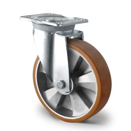 Jest to ruchomy zestaw kołowy do dużych obciążeń. Ma wysoką nośność do 500 kg i dlatego nadaje się do najbardziej ciężkich ładunków. Ten wytrzymały zestaw obrotowy ma masę własną 2,1 kg i jest wykonany z szarego aluminiowego rdzenia z bieżnikiem z brązowego poliuretanu. Krótko mówiąc, kółko samonastawne, które nadaje się do przenoszenia ciężkich ładunków. Średnica wynosi 125 mm, koło nie pozostawia pasów na powierzchni i tłumi dźwięk. Dzięki materiałowi rdzenia koła, szaremu aluminium, jest to bardzo mocne i trwałe koło.