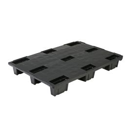 Paleta wykonana z tworzywa sztucznego - regranulat HDPE z obręczami zabezpieczającymi (ranty) koloru czarnego. Masa własna palety to 5,7 kg. Możliwości prezentowanej palety to 1200 kg nośność dynamiczna, a statyczna to 2500 kg.