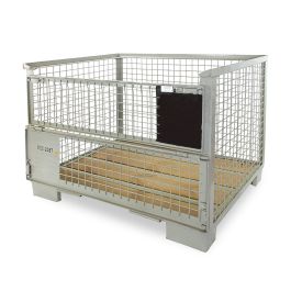 Zgodny z normą UIC 435-3 pojemnik metalowy GITTERBOX z dwoma uchylnymi klapami na dłuższym boku, kolor szary RAL 7030.