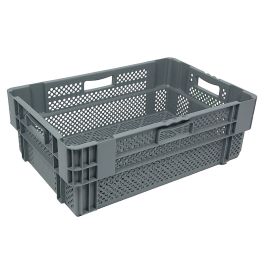 Plastikowy pojemnik 600x400x245mm - perforowany. Pojemnik wykonany z wysokiej jakości tworzywa sztucznego. Budowa pojemnika to perforowane dno oraz ścianki, pozwalające na swobodny przepływ wilgoci oraz powietrza. Zalecany w chłodniach oraz mroźniach i wszędzie tam gdzie jest wymagana wysoka cyrkulacja powietrza. Plastikowy pojemnik sztaplowany do optymalnego wykorzystania przestrzeni. Zewnętrzne wymiary tego pojemnika to 600x400x245mm. Wymiary wewnętrzne to 560x356x224mm, pojemność wynosi 47 litrów. Przy wadze zaledwie 1.9kg, jest to bardzo lekki pojemnik. Na europalecie mieści się 72 sztuk. Całkowita wysokość stosu na palecie wynosi 2400 mm.
