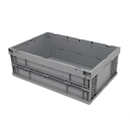 Składany pojemnik plastikowy 594x396x214mm 39 litrów. Składany plastikowy pojemnik zwany także składakiem. Ten pojemnik z tworzywa sztucznego o zamkniętych ścianach i dnie posiada pojemność 39 litrów. Zewnętrzne wymiary tego pojemnika to 594x396x214mm. Wymiary wewnętrzne natomiast to 558x362x194mm. Po złożeniu zajmuje tylko 74 mm wysokości i waży jedynie 2,38 kg, jest to jeden z wytrzymalszych pojemników z tworzyw sztucznych wśród składanych skrzynek. Na palecie typu blok zmieści się 85 sztuk. Całkowita wysokość stosu na palecie wynosi 1200 mm.