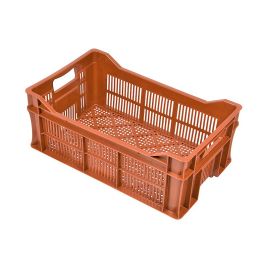 Skrzynka na owoce i warzywa, wykonana z HDPE, ma standardowy kolor terakoty i jest idealna dla sektora rolniczego. Pojemnik ma ażurowe dno i ściany boczne, posiada dwa otwarte uchwyty.