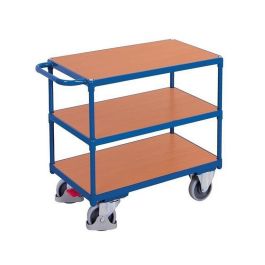 Ten wózek stołowy jest wykonany z rurek stalowych i profili stalowych, które są spawane, piaskowane i odporne na zarysowania w kolorze RAL 5010 (niebieski). Powierzchnia ładunkowa składa się z płyty MDF, która jest wykończona górną warstwą tworzywa sztucznego o strukturze bukowej. Wózek platformowy ma wymiary 1190 x 700 x 920 mm, a półki mają wymiary 1000 x 700 mm. Wózek posiada niski uchwyt do prowadzenia, maksymalny udźwig 500 kg i ciężar własny 55,5 kg. Wózek stołowy posiada 2 kółka stałe i 2 kółka skrętne z pełnej gumy o średnicy 200 mm.